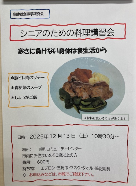 「シニアのための料理講習会」12月13日(土)10:30~。 申込みは12月3日(水)~、お待ちしています。