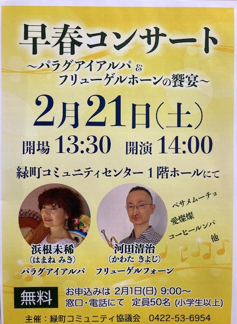 パラグアイアルパとフリューゲルホーンの デュオを楽しめるコンサート。 2月21日(土)14:00開演。 申込みは2月1日(日)~です。
