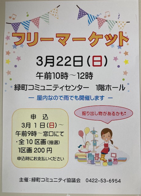 フリーマーケットを開催します。 お買い物は申込み不要です! 3月22日(日)10:00~12:00。 3連休の最終日です。