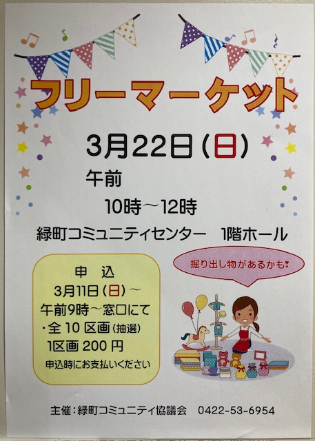 フリーマーケットを開催します。 お買い物は申込み不要です! 3月22日(日)10:00~12:00。 3連休の最終日です。